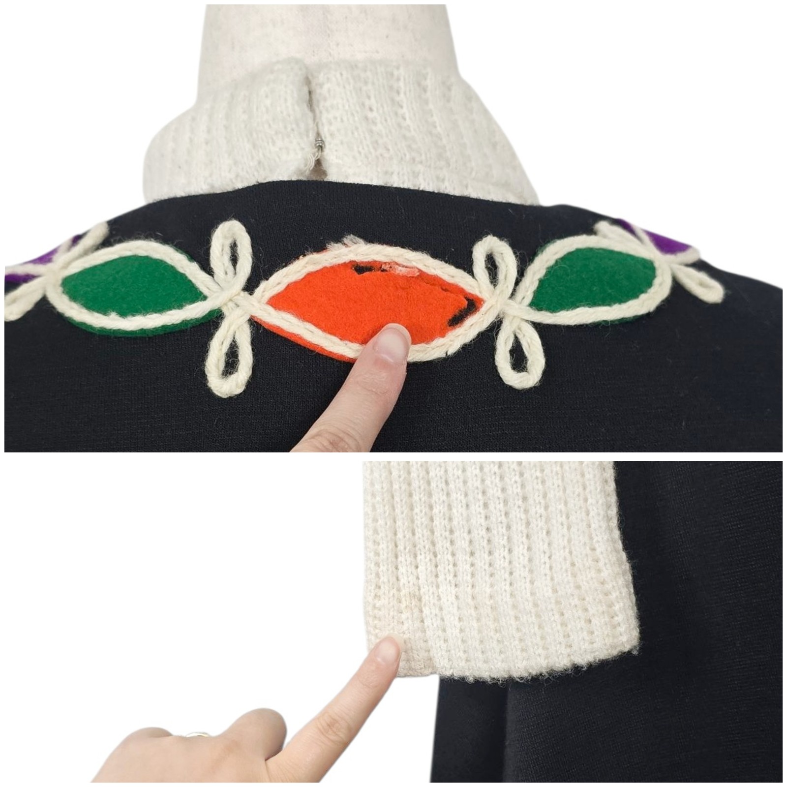 1960s Vintage Folk Dress, Vest, & Belt Set. This heavy knit 60s ethnic midi features a stretchy long sleeve cable knit top w/ a mockneck collar. Cinches at the waist. A line skirt w/ braided stripes on the hem. Matching vest w/ swirl design & colorful green, purple, & orange felt appliques. Back zip. Belt not original but is included. By The Kollection Ltd, union made. Faint spots on wrists & a few pulls in the knit. Looks like someone re-glued down one of the appliques on back neck. Stretchy top no stretch in waist. Fits Small - Medium 34-40" Bust, 28" Waist
