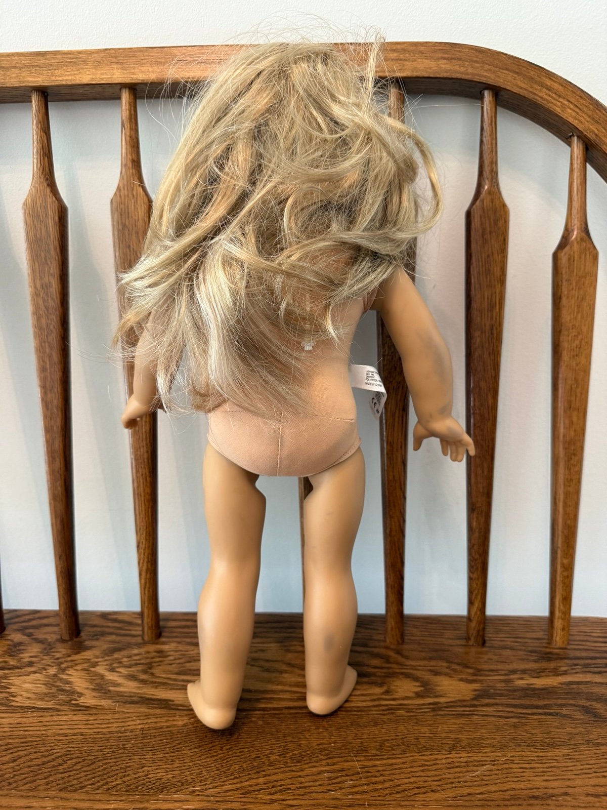 Authentic American Girl Doll with beautiful blue eyes and long blonde hair. Marked (c)2013 on tag. She's in great preowned condition -- clean cloth body, limbs hold poses well, and eyes open/close properly. Hair could use light detangling or restyling. Perfect for play, restoration, or as part of a collection!
