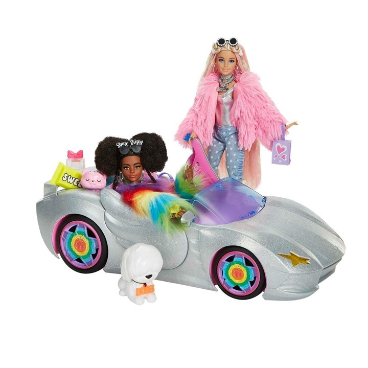 Barbie Extra Convertible Toy Car with Puppy & Accessories, Sparkly Silver 2-Seater