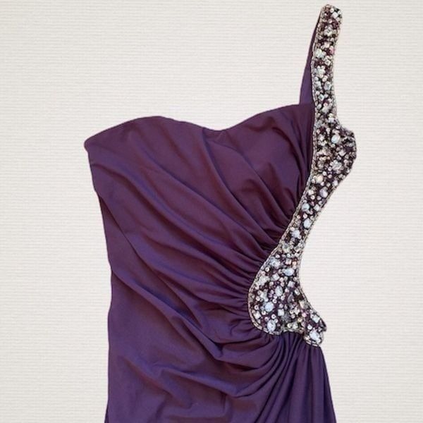 Feel stunning in this eggplant purple embellished gown. This dress is NEW in garment bag. MSRP: $299. 1-shoulder embellished (extra beads on tag). Approximate flat measurements: 16" bust, 12.5" at waist, 56" long (excluding strap length). 100% stretch polyester with hand-sewn beading. Model photos outdoors, other photos indoors with natural/indoor lighting mix.