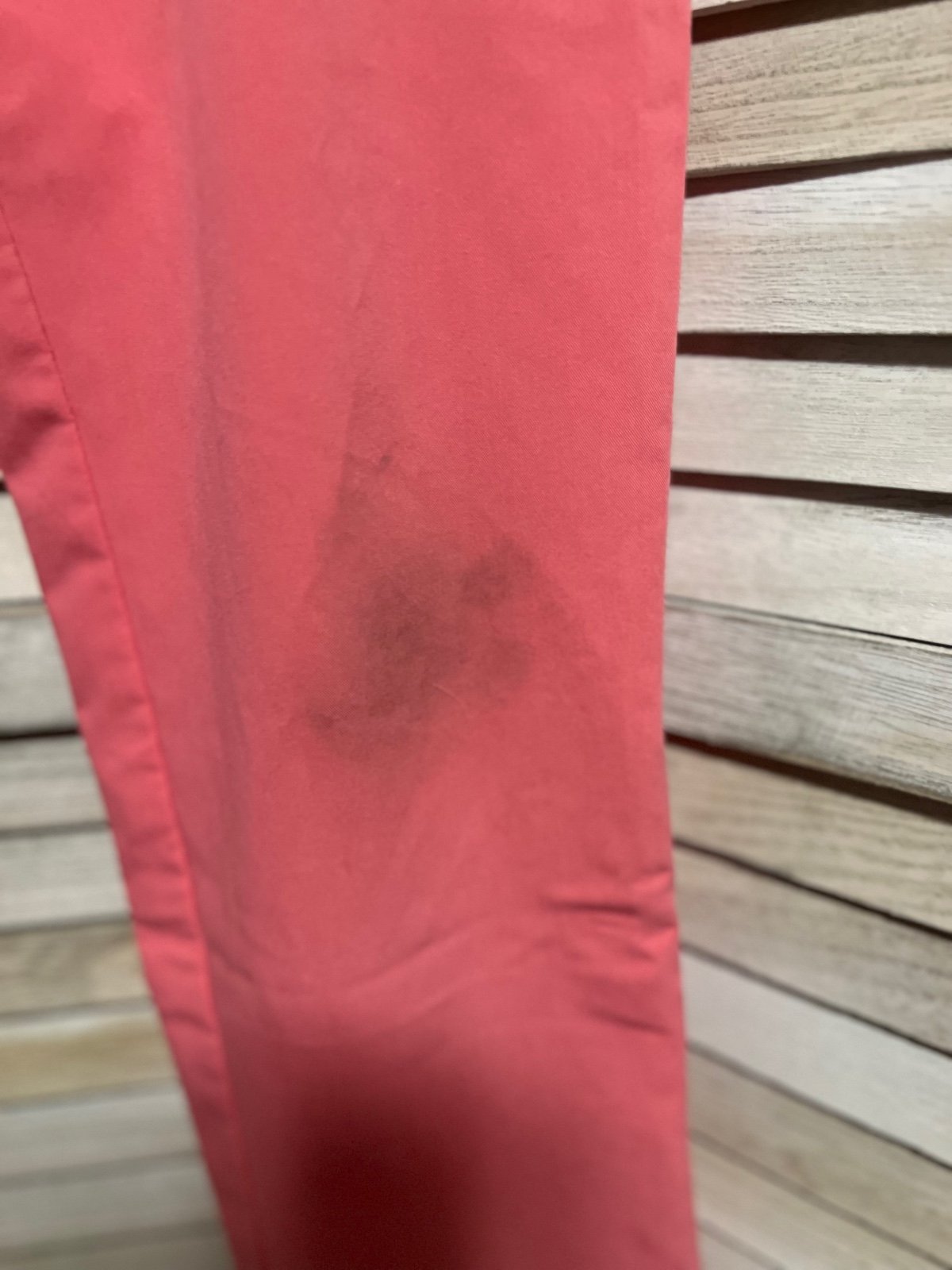 Damage-right side has a pea sized stain, the left side pocket has a small pea size pen stain and pen scuff at the top. Knees have permanent scruff stain damage.