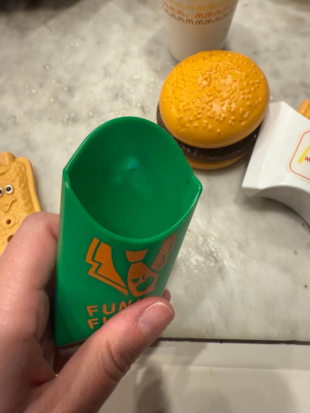 Flute and cup have the melted damage. The happy meal box closes, but has a little bit of a gap and is a little wonky.