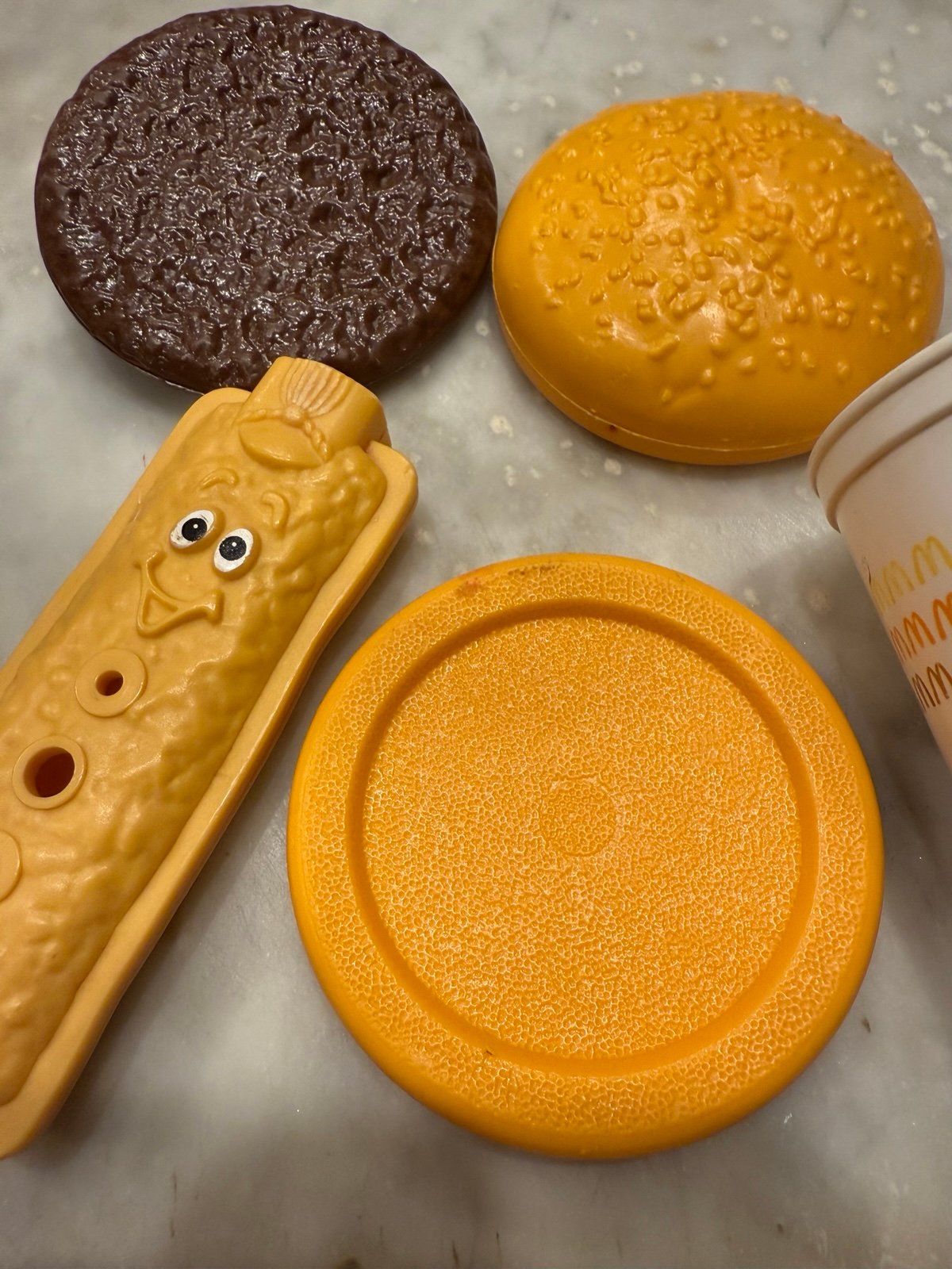 Cup lid doesn’t fit like it used to where the coffee cup has a melted spot at the top. Some staining on sides of box and inside, as well as a couple minor spots on the items. Has been colored on the outside top on McDonald’s logo (maybe silver sharpie?)