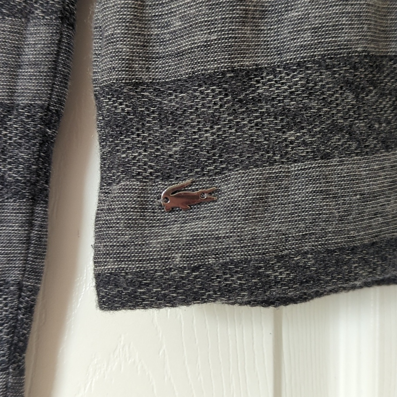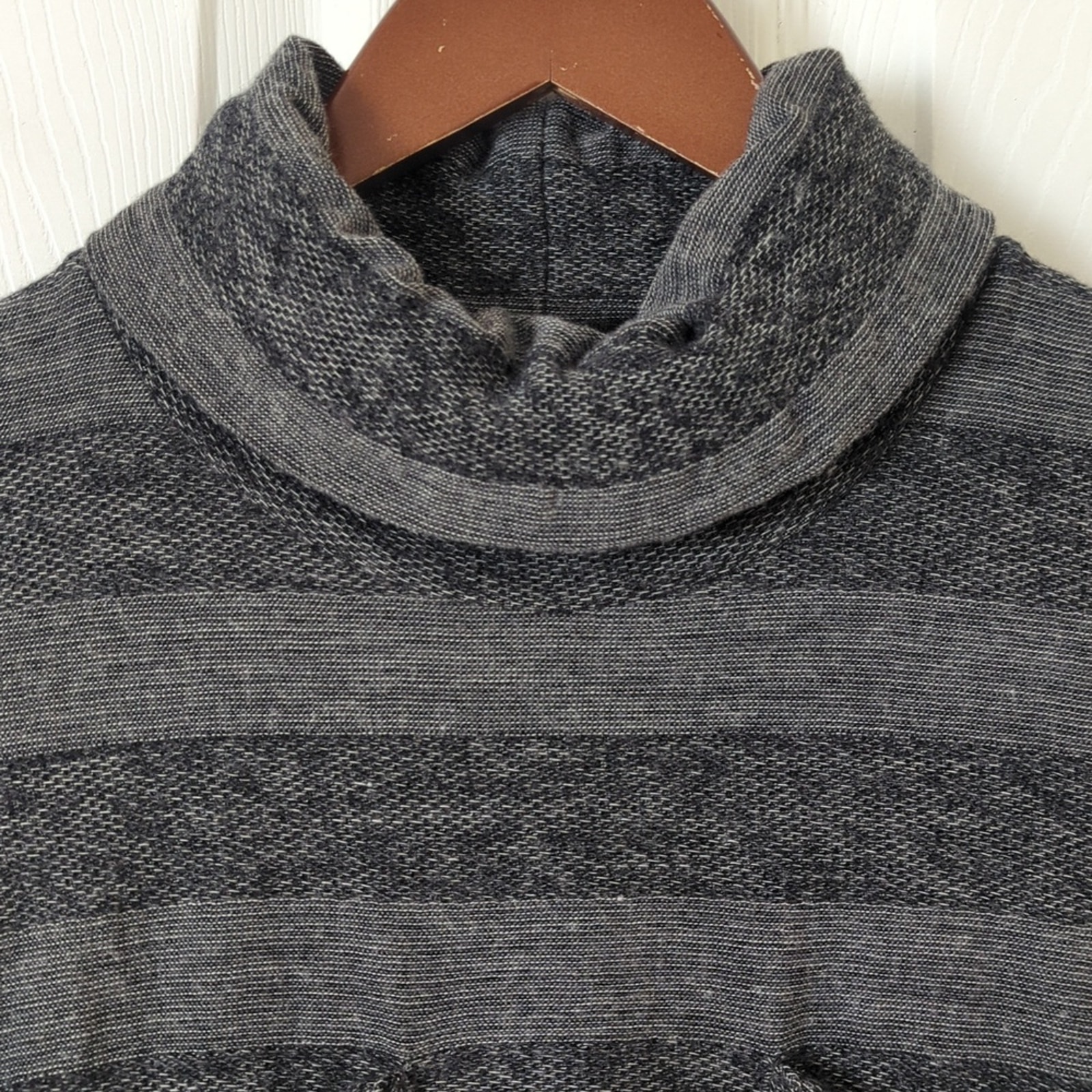 This super cute sweater features a turtleneck, open pockets with faux flap details on the upper chest, and long sleeves. It has a gray and dark gray horizontal striped knit with a small silver brand charm near the right hip. It is soft, warm, and comfortable with a casual, relaxed fit. Perfect to