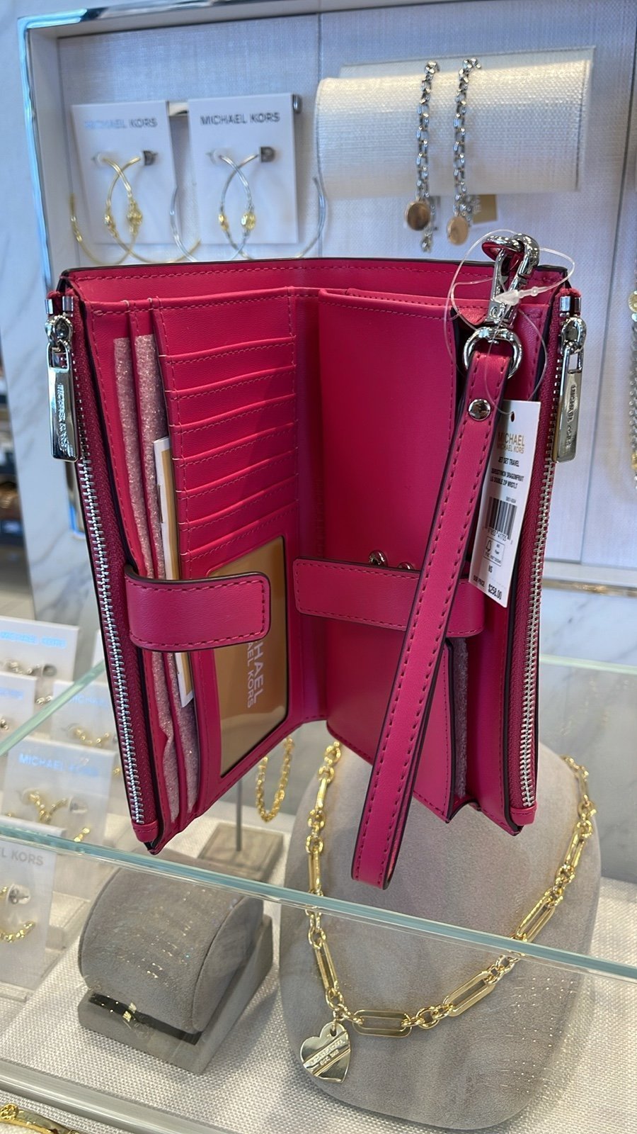 • Interior details: 2 zip pockets, 6 card slots, phone pocket, ID window, 3 slip pockets