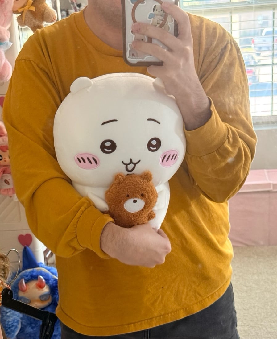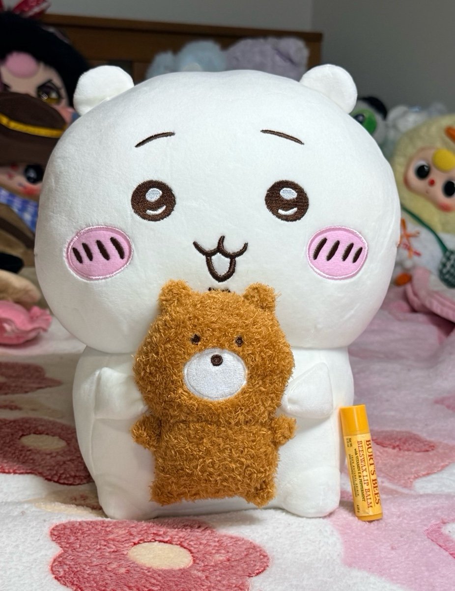 i'm rehoming this lovely huge chiikawa plush!!! he stands at 30cm and is happily holding his teddy bear, which can easily be removed (it's held by plastic tag-like wire) if you'd like to customize him holding something else. he's only been on display for a short time and has no wear and tear. lip balm for scale in the second pic, lol