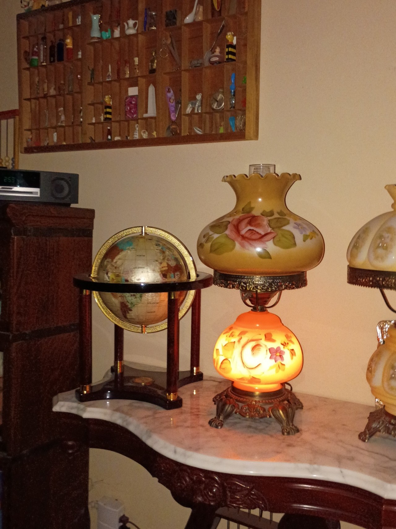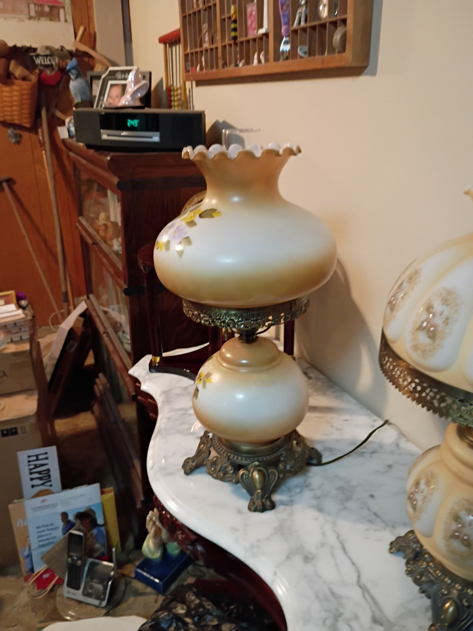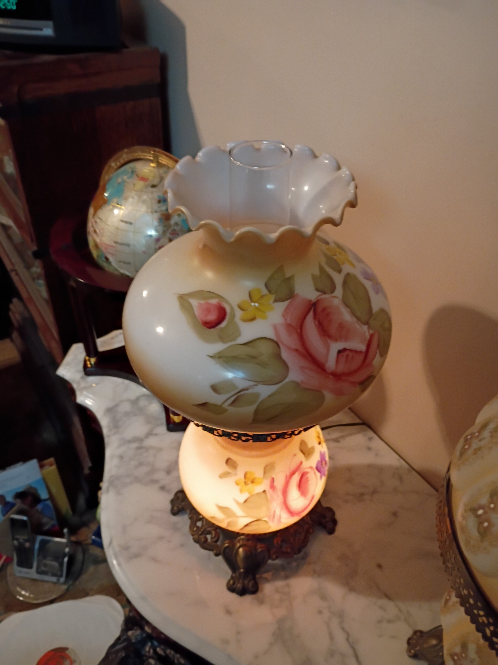 This gone with the wind lamp is 11"w x 20"h. Vintage. It's got solid building materials that are like the filigree it's thick it's not flimsy. the glass is hand painted. High Quality lamp. Beautiful colors from base colors to outstanding flowers that in the middle of flowers you can feel raised white paint. Outstanding. It's a great lamp at a good price for solid, detailed family heirloom pieces.