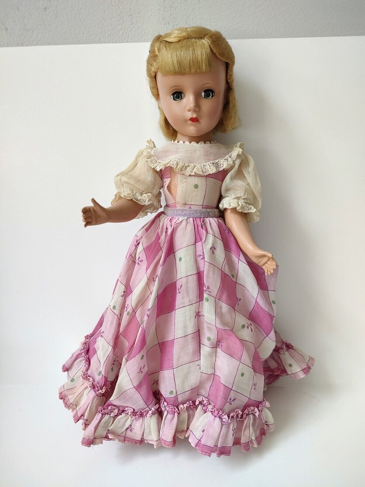 Vintage MA doll , measures about 14" , no odors, clear working sleep eyes, she has been restrung at some point, dress is torn, outfit has wear . Please see pictures for more condition and feel free to ask any questions.