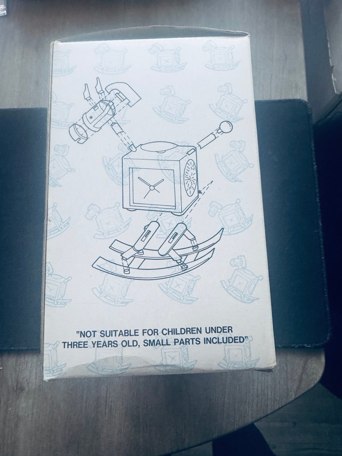 ~ Vintage, New in Open Box,1990s Post Modern Fun Pop Art Rocking Pony Alarm Clock has the unique feature of the Sound