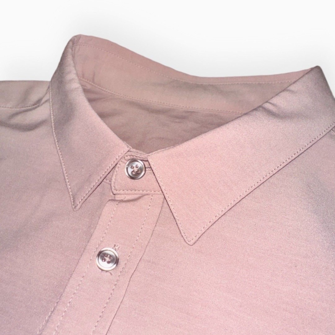 * Accents: Premium semi-translucent buttons with a subtle cross/knot pattern. Classic low-profile Point Collar.