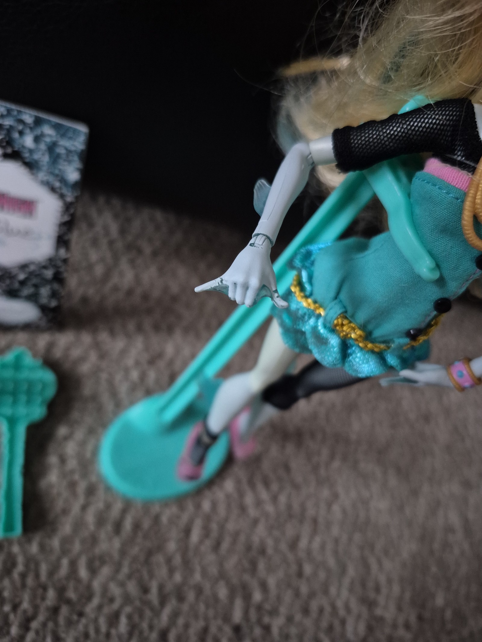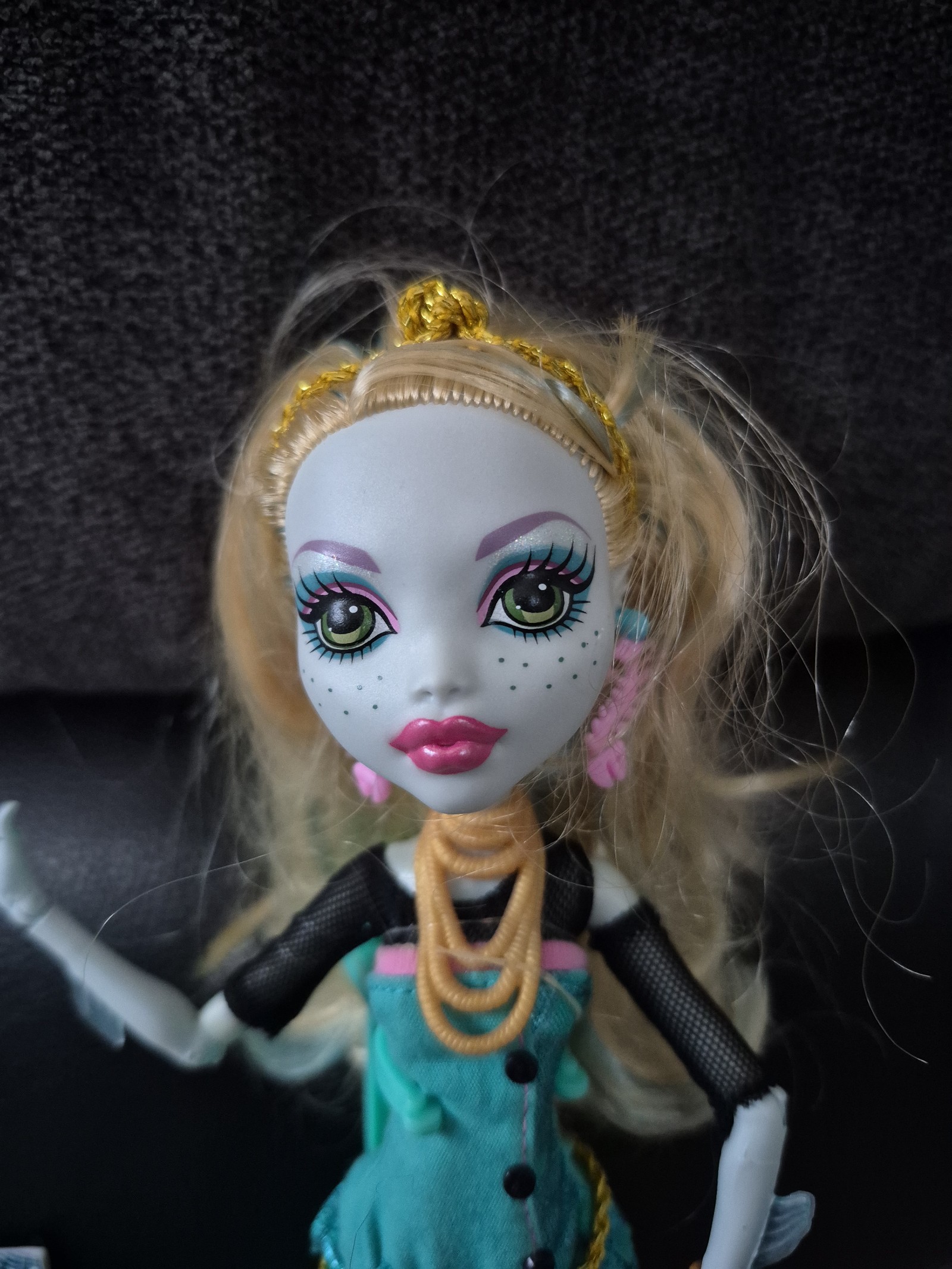 You get Lagonna blue. She still has both earrings,headband,bracelet,and necklaces.she also has her purse,folder,diary, and hair brush. Her fish nets are in good condition, too. She has a paint flaw on her right hand pictured in photos 4 and 5. Her limbs are still tight seen in photo 6. You get her stand, too. Great for display. Smoke-free home.